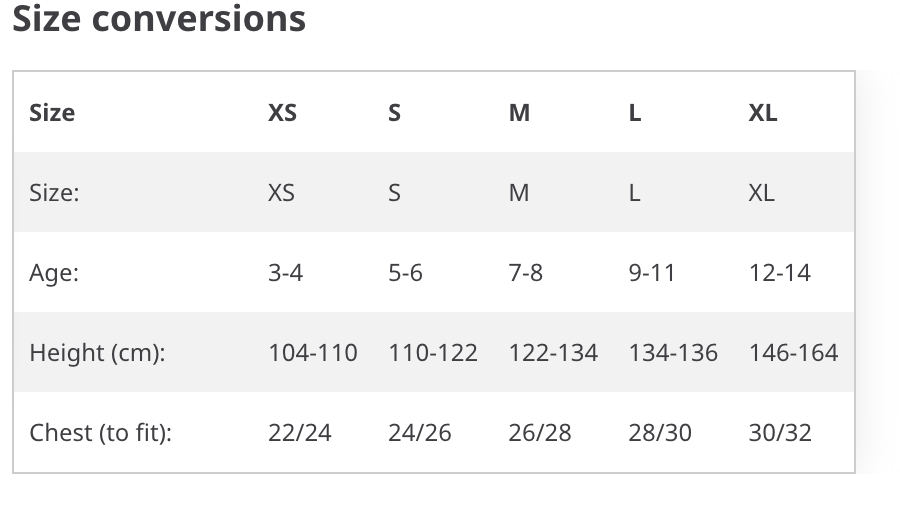 | Size | XS 3/4, S 5/6, M 7/8, L 9/11, XL 12-14 |